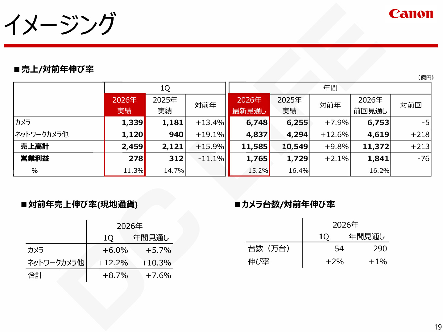 年間については、市場の先行きの不透明感から、前回計画からレンズ交換式カメラの販売台数を引き下げますが、スマートフォンとは異なる撮影体験を目的とした若者中心の新しいカメラユーザーの増加は今後も続くと想定しており、昨年を上回る売上を見込んでいます。コンパクトカメラについては、需要に応えきれていない状況を一日も早く解消できるよう、さらなる増産体制を築き、大きく販売を伸ばし、カメラとしては年間で7.9%の増収を目指していきます。※ 説明会資料(ノート付き)より
