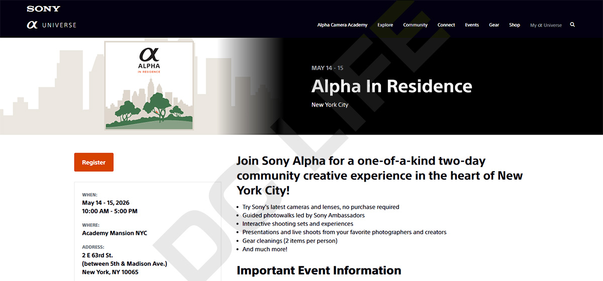 SARによると、ソニーは5月14日・15日の両日、ニューヨークにて体験イベント「Alpha In Residence」を開催するとのこと。これに伴い、前日の5月13日に新製品の公式発表が行われる可能性が浮上しました。
