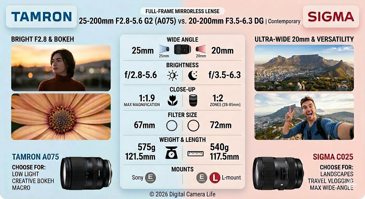 売れ筋の高倍率ズームレンズ タムロン「25-200mm F/2.8-5.6 Di III VXD G2 (Model A075)」とシグマ「20–200mm F3.5–6.3 DG | Contemporary」の基本スペックを比較しました。※Eマウント用で比較